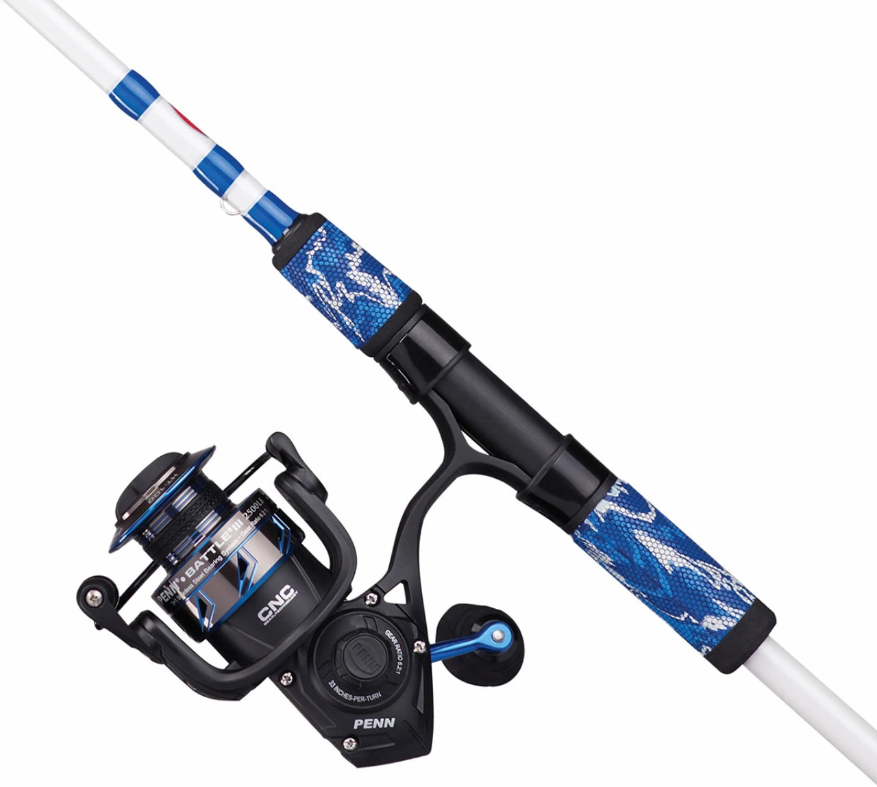 Penn Battle III LE Spinning Combos are made with durability and ultimate control during the fight in mind, with CNC gear technology and HT-100 carbon fiber drag system. These combos are going to provide the comfort you need during long days on the water. These combos feature one-piece stainless steel dura-guides, eliminating guide insert pop outs.